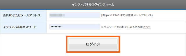 先ほどのメールに記載されていた「会員ID」と「インフォパスワード」を入力してログインをクリックします。