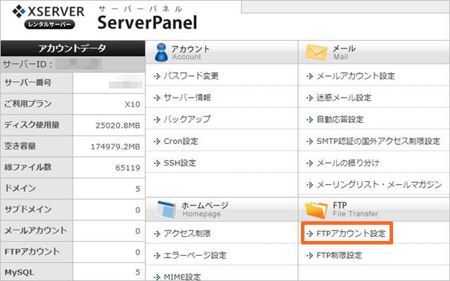 - 「FTPアカウント設定」を開くと、FTP情報が表示されます。