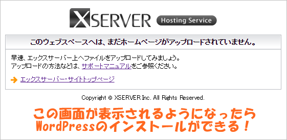 一方、「このウェブスペースへは、まだホームページがアップロードされていません。」と表示されていれば、WordPressのインストールができる状態ですので、次の工程に進みましょう。