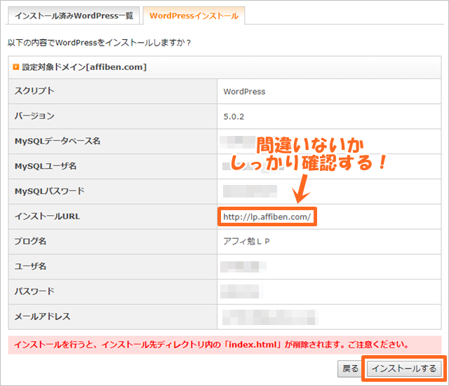間違ってルートドメインにWordPressをインストールすると、サイトが上書きされてしまうのでここは本当に要注意です。