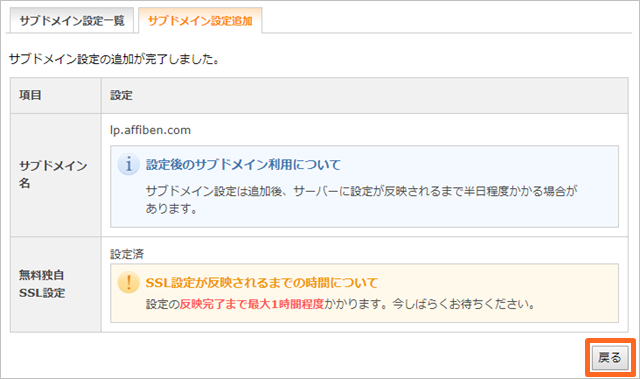 「サブドメイン設定の追加が完了しました」と表示されればサブドメインの設置は完了ですので、戻るをクリックします。