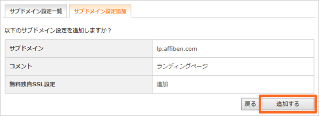 サブドメインに誤りがないかを確認して、追加するをクリックします。