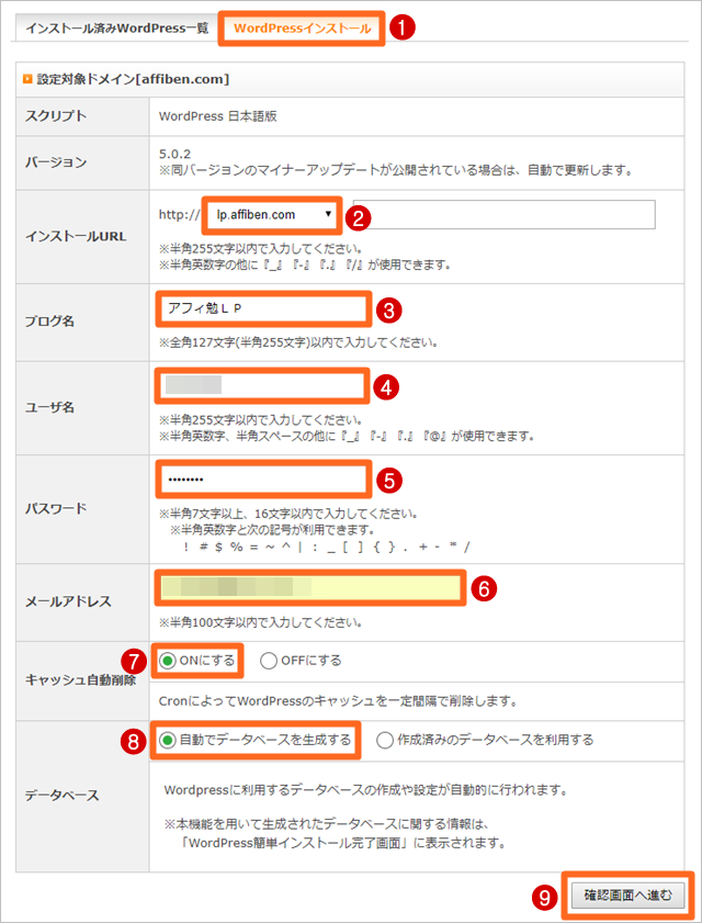 | 3 | 「WordPress簡単インストール」から必要情報を入力 |